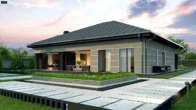 Z565132 + 35 m²Dom parterowy z centralnie umieszczoną strefą dzienną oraz garażem na 2 auta.