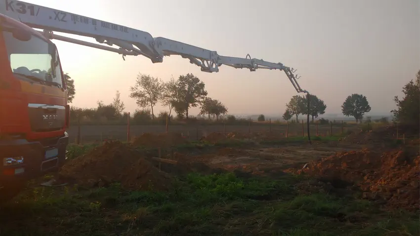 O 6 rano przyjechał beton i mamy już wylanego chudziaka. Pompa o rozpiętości 28,5 m prawie na styk sięgnęła na tył wykopu.