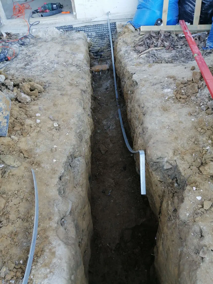 Brak bednarki, czyli uziomu otokowego domu musieliśmy zastąpić uziomem pionowym. Pierwsze podejście do tematu nie było udane. Pręt wszedł na głębokość 1,5 metra i utknął w skale, czego się bardzo obawialiśmy mając w pamięci wykopy pod fundamenty. Drugie podejście też nie było udane, bo pręt wszedł na głębokość 3 metrów. Trzeciej próby już nie było. W sobotę zrobimy pomiary czy tyle wystarczy czy konieczne będzie wbicie kolejnych 3 metrów pręta obok. Kupione jest 6 m więc strachu nie ma.