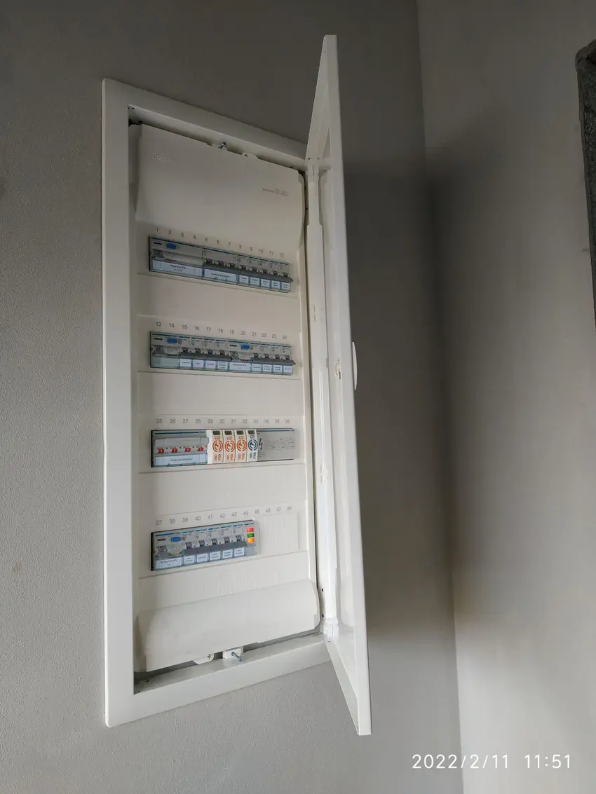 Etap instalacji elektrycznej mamy zakończony. Niespodziewanie, na 4 dni przed terminem, Panowie z PGE zadzwonili i przyjechali podłączyć licznik. Dokończyliśmy całą instalację wewnętrzną, rozdzielnię, podłączyliśmy kabel ze skrzynki do domu i wreszcie jest prąd. Mamy nadzieję, że kolejne etapy pójdą szybciej... bez prądu trudno było pracować gdy dzień kończy się o 16-tej... W umowie przyłączeniowej mieliśmy określony termin przyłącza na listopad 2022 r., jednak wydeptanie prze Renatę ścieżki do PGE, kilka pism o przyspieszenie terminu zrobiło swoje. Proponujemy wszystkim nie odpuszczać tematu i przypominać się cały czas, najlepiej pisemnie.