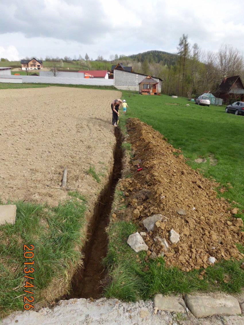 Łopata w ziemię!!!! Odwodnienie liniowe wzdłuż działki,osadzenie rury filtracyjnej - przygotowanie terenu przed wykopaniem fundamentów.