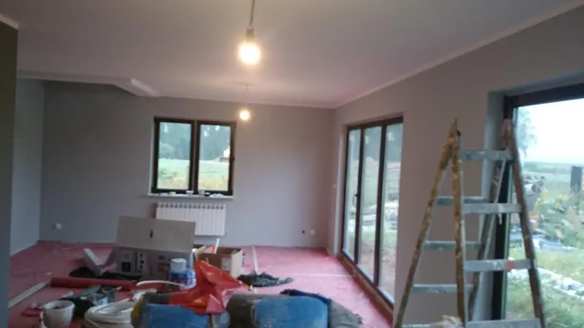 Salon pomalowany, pozostało zaimpregnowanie cegiełki na ścianie i obróbka okien.