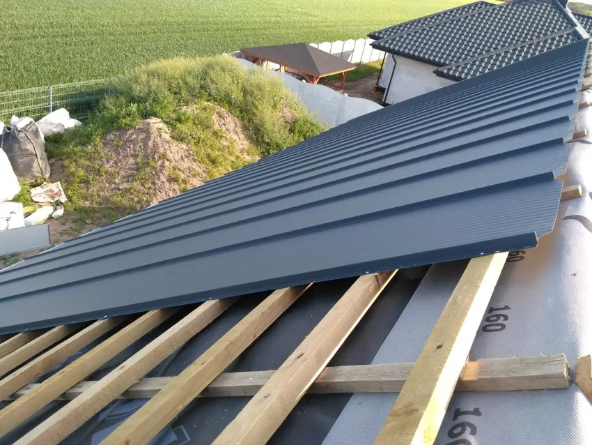 Dach prawie skończony. Pokrycie to panale na rabek stojący Pruszyńskiego z połoką mat gruboziarnisty w kolorze antracyt. Panele wymagają równej połaci. Dużo czasu poświęciłem na wyrównywanie, aby zmniejszyć do minimum możliwość powstawania pofalowań blachy spowodowanych jej rozszerzalnością termiczną.