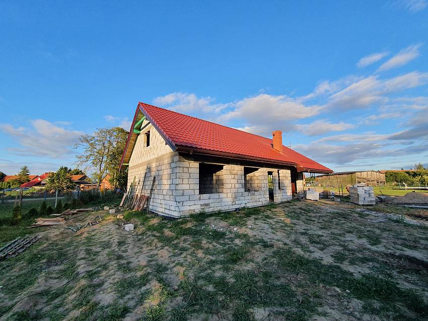 dach zakończony, obróbki blacharskie i orynnowanie zawieszone. Jeszcze ścianki działowe, filary pod zadaszeniem tarasu i SSO zamykamy.